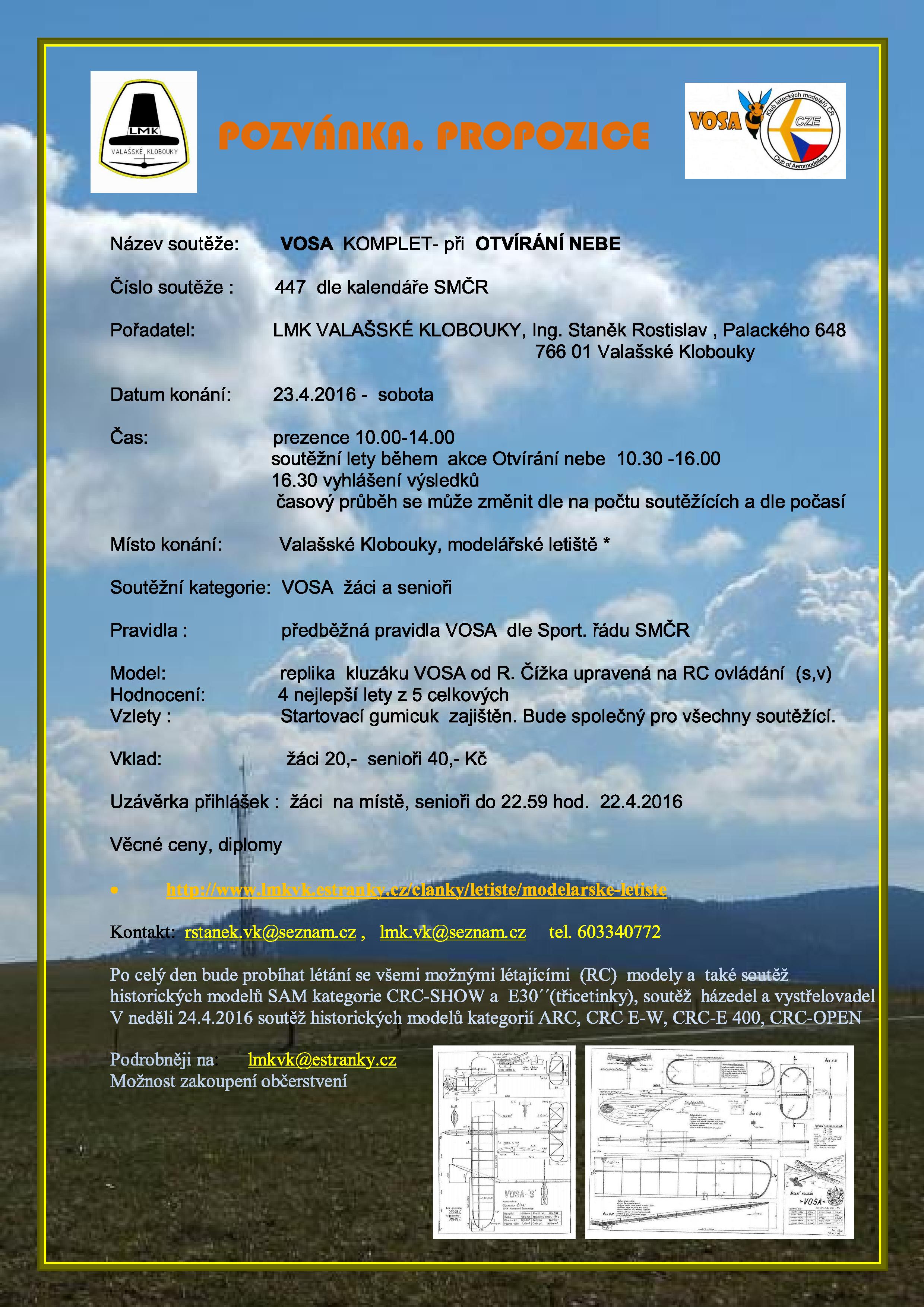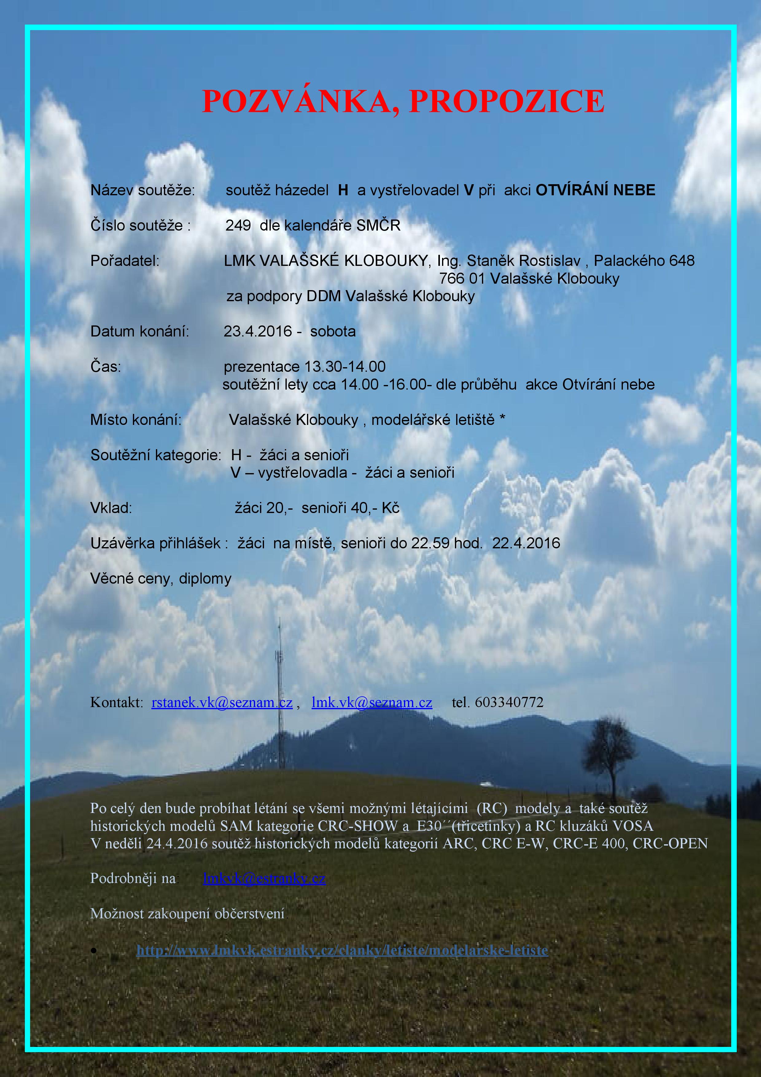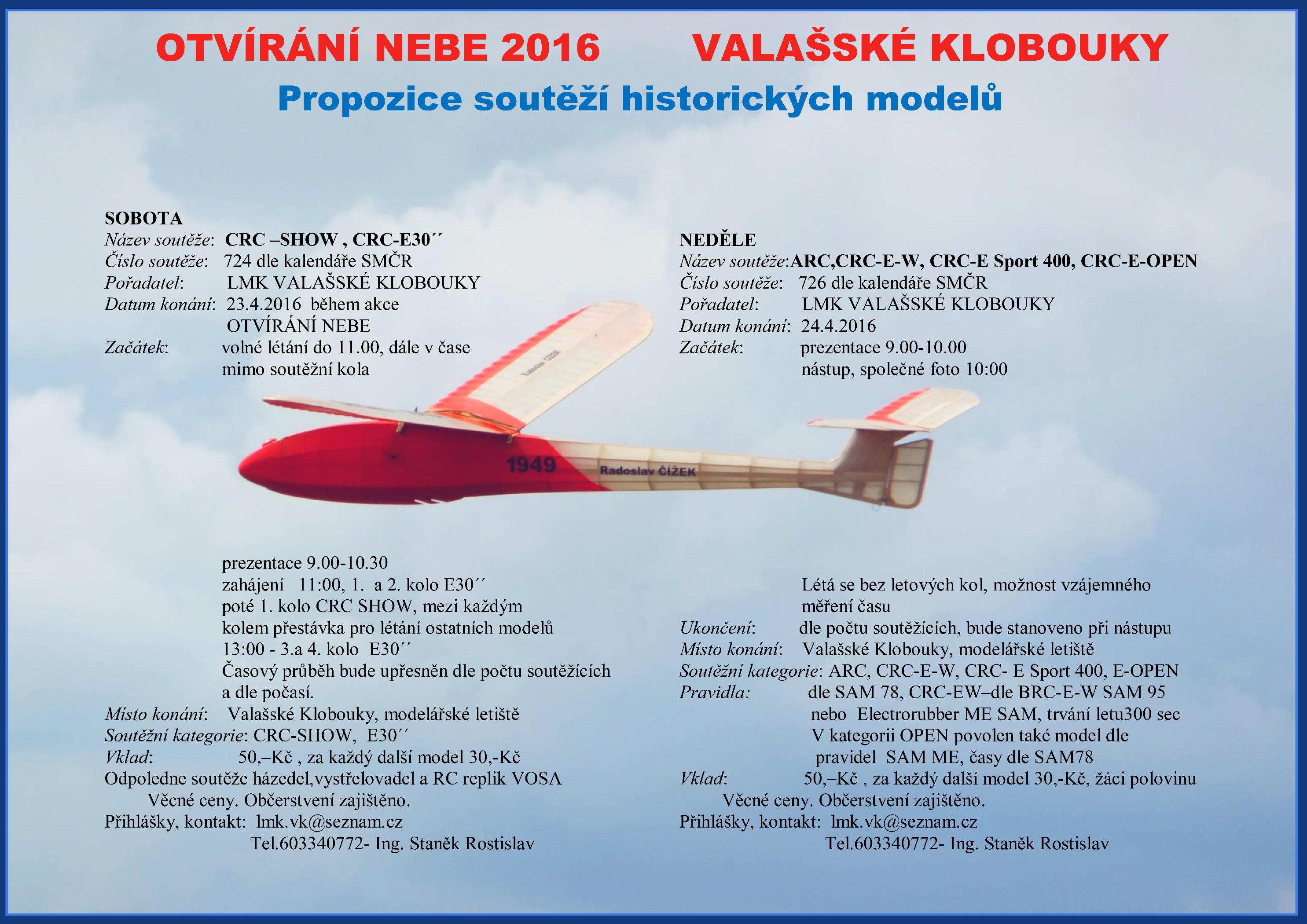 V rámci tradiční akce, našeho leteckomodelářského klubu, „Otvírání nebe“ jsme v sobotu 23. 4. 2016 uskutečnili několik soutěží. Sobotní dopoledne začalo volným létáním, po kterém následovala první dvě kola soutěže historických modelů E 30“ a CRC Show. Odpoledne se soutěžilo s házedly a vystřelovadly a nově se uskutečnila soutěž v kategorii VOSA. Na závěr dne byla 3. a 4. kolem dokončena soutěž „třicetinek“.